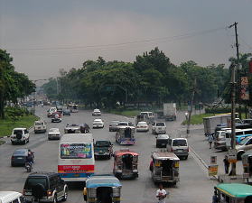 道中の道路はひどい混雑である。片側4車線の道路だったが、どの車も我先へと前へ進むために車線変更をするので接触しそうになるわ、それを避けるため何度もクラクションを鳴らすわで、こわい思いをした。信号のあるところでは、信号が赤になり車が停止すると、道路脇から水や手製のハンドル拭きタバコ等雑貨を持った売り子が、車と車の間を歩き回るため、危険というか何か混沌とした状況であった。しかし、マニラの交差点の多くは信号のないトラフィックサークルと呼ばれる交通システムを採用している(日本ではロータリーといわれる)。ケソンメモリアルサークルなどは、10車線もある巨大なもので、サークル内で、車はかなりのスピードを出している。脇道から主要道路に入る時は、右折進入は簡単だが、左折はいったん右折してUターンゾーンでUターンして戻ってくる。慣れないと難しそうであるが、信号待ちはないし、信号機の設置および制御の必要も無く、合理的だと思った。
