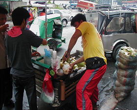 フィリピン旅行での楽しみのひとつに、ココナツジュースを思う存分飲むことがあった。「蒸し暑いフィリピンでの滞在を乗りきるために、毎日1個分のココナツを飲むぞ」と意気込んでいた。しかし、これがなかなか売っていないのである。SMの地下のフードコーナーで売っていたのは、ココナツの濃縮液を冷水で薄めた商品であった。まちがいなくココナツジュースであるが、私が飲みたいのは、そのような人工的なものではなく、もぎとったばかりの緑のココナツを割って得られる、生ココナツジュースである。ココナツを入手できないまま、ホテルの近くの小さなショッピングセンターを歩いていると、フルーツジュースの店の床にココナツが転がっているのを発見した。ショーケースの中にスイカやマンゴ、パパイヤなどのフルーツが切って並べてあり、客が好きな果物を選ぶと、ミキサーにかけてジュースにしてくれる店である。私はここでココナツジュースを入手することにした。店員に「ココナツをくれ」と頼むと、「ココナツと何を入れるのか」と聞いてくる。「いやいやココナツをチューっと吸いたいのよ」いうと、笑いながらココナツを拾い上げて割り、中身をビニール袋に移しストローをさしてくれた。こういうのみ方もはじめてである。お値段は16ペソ(64円)。果物2種類のジュースで20ペソ。ちなみに500mlのペットボトルも店によって違うが20ペソ程度である。以後、ほぼ毎日この店でココナツを割っていただくことになる。多分、マニラではコーラなどの商業ジュースがかっこいい飲み物で、ココナツなんて昔からある田舎くさい飲み物と認識されているのだろう。フィリピンでの最後の日に、リヤカーにココナツを積んで売っているところを見かけた。1つ買うと、お兄さんは小刀一本で、ココナツの皮部分だけを剥き、ココナツミルクといわれる薄皮だけにするという芸術品にしてくれた。これだと軽くて、ミルクの部分も食べやすい。ココナツもここまでしないと売れないのかと商業主義を実感した。