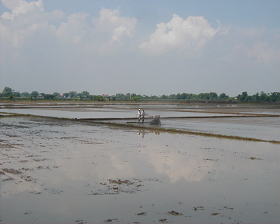 高速に入ってしばらく行くと、緑の草原が広がり、牛がところどころに顔をのぞかせている。大都会マニラを離れ、ほっとする風景である。放牧場というわけではなく、耕す前の水田に草が茫々に生えているところに、農家の飼い牛が放されているようである。今年のフィリピンは雨季の始まりが遅れており、もみまき時期も遅れている。私たちは、あまり恵まれていないと言われる村へ行き、農業組合を訪れ、話を聞いた。「恵まれていない」の意味は、土地が低く洪水の影響を受けやすい上に、灌漑整備が十分にできていないために、年に1回、最悪の時は1度もコメの収穫期を迎えられないという意味である。十分でない灌漑施設であっても、所有者に使用料を支払わなければならない。恵まれた土地の農民は年に3回コメを収穫し、個人の灌漑施設を持っているため、使用料も払う必要がない。どこへ行っても、上を見たらきりがないが、下もきりがない。というのは、土地なし農民も存在し、もみまきや刈入などの農繁期に、農家を転々として、農作業を行う人々もいるからだ。農村にも、フィリピンの富裕層と貧困層の現実を見ることができる。